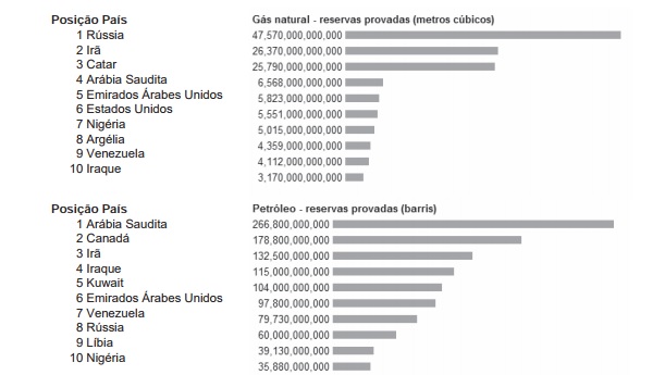 No mundo contemporâneo, as reservas energéticas tornam-se estratégicas para muitos países no cenário internacional. Os gráficos apresentados mostram os dez países com as maiores reservas de petróleo e gás natural em reservas comprovadas até janeiro de 2008.