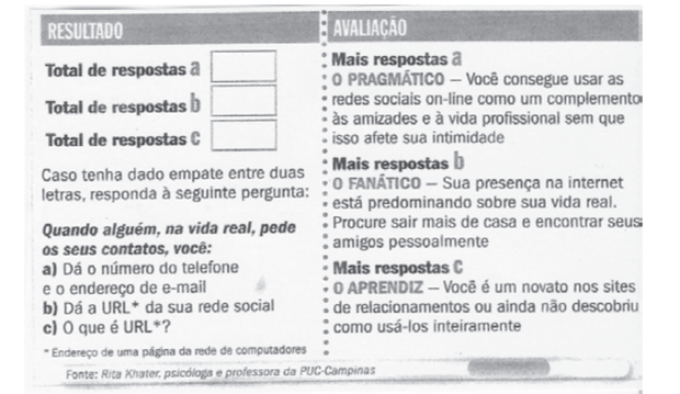 Depreende-se, a partir desse conjunto de informações, que o teste que deu origem a esses resultados, além de estabelecer um perfil para o usuário de sites de relacionamento, apresenta preocupação com hábitos e propõe mudanças de comportamento direcionadas