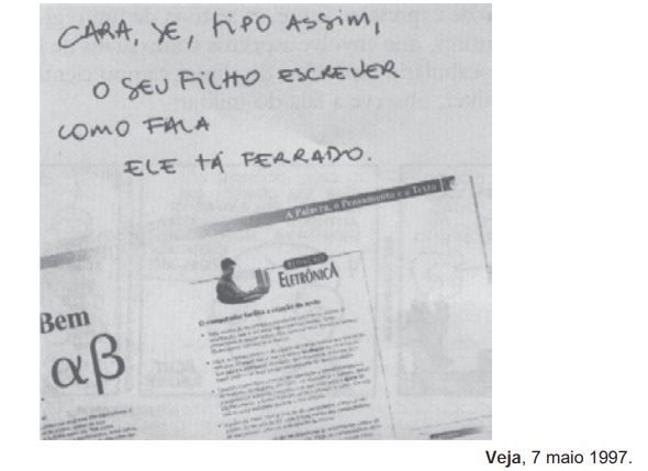 Na parte superior do anúncio, há um comentário escrito à mão que aborda a questão das atividades linguísticas e sua relação com as modalidades oral e escrita da língua. Esse comentário deixa evidente uma posição crítica quanto a usos que se fazem da linguagem, enfatizando ser necessário