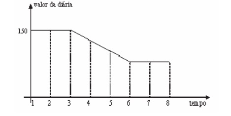 Uma pousada oferece pacotes promocionais para atrair casais a se hospedarem por até oito dias. A hospedagem seria em apartamento de luxo e, nos três primeiros dias, a diária custaria R$ 150,00, preço da diária fora da promoção. Nos três dias seguintes, seria aplicada uma redução no valor da diária, cuja taxa média de variação, a cada dia, seria de R$ 20,00. Nos dois dias restantes, seria mantido o preço do sexto dia. Nessas condições, um modelo para a promoção idealizada é apresentado no gráfico a seguir, no qual o valor da diária é função do tempo medido em número de dias.