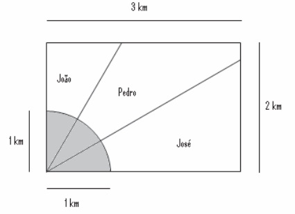 Ao morrer, o pai de João, Pedro e José deixou como herança um terreno retangular de 3 km x 2 km que contém uma área de extração de ouro delimitada por um quarto de círculo de raio 1 km a partir do canto inferior esquerdo da propriedade. Dado o maior valor da área de extração de ouro, os irmãos acordaram em repartir a propriedade de modo que cada um ficasse com a terça parte da área de extração, conforme mostra a figura.