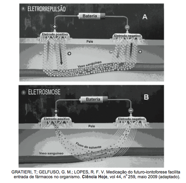 Um medicamento, após ser ingerido, atinge a corrente sanguínea e espalha-se pelo organismo, mas, como suas moléculas “não sabem” onde é que está o problema, podem atuar em locais diferentes do local “alvo” e desencadear efeitos além daqueles desejados. Não seria perfeito se as moléculas dos medicamentos soubessem exatamente onde está o problema e fossem apenas até aquele local exercer sua ação? A técnica conhecida como iontoforese, indolor e não invasiva, promete isso. Como mostram as figuras, essa nova técnica baseia-se na aplicação de uma corrente elétrica de baixa intensidade sobre a pele do paciente, permitindo que fármacos permeiem membranas biológicas e alcancem a corrente sanguínea, sem passar pelo estômago. Muitos pacientes relatam apenas um formigamento no local de aplicação. O objetivo da corrente elétrica é formar poros que permitam a passagem do fármaco de interesse. A corrente elétrica é distribuída por eletrodos, positivo e negativo, por meio de uma solução aplicada sobre a pele. Se a molécula do medicamento tiver carga elétrica positiva ou negativa, ao entrar em contato com o eletrodo de carga de mesmo sinal, ela será repelida e forçada a entrar na pele (eletrorrepulsão – A). Se for neutra, a molécula será forçada a entrar na pele juntamente com o fluxo de solvente fisiológico que se forma entre os eletrodos (eletrosmose – B).