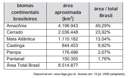 O quadro apresenta informações da área aproximada de cada bioma brasileiro.