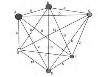 João mora na cidade A e precisa visitar cinco clientes, localizados em cidades diferentes da sua. Cada trajeto possível pode ser representado por uma sequência de 7 letras. Por exemplo, o trajeto ABCDEFA, informa que ele sairá da cidade A, visitando as cidades B, C, D, E e F nesta ordem, voltando para a cidade A. Além disso, o número indicado entre as letras informa o custo do deslocamento entre as cidades. A figura mostra o custo de deslocamento entre cada uma das cidades.