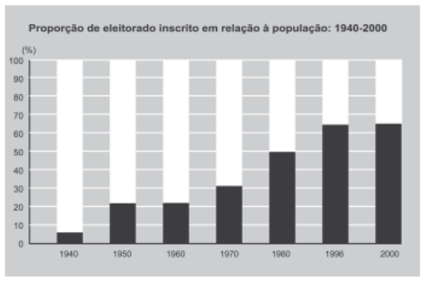 A análise da tabela permite identificar um intervalo de tempo no qual uma alteração na proporção de eleitores inscritos resultou de uma luta histórica de setores da sociedade brasileira. O intervalo de tempo e a conquista estão associados, respectivamente, em