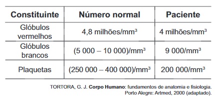 Um paciente deu entrada em um pronto-socorro apresentando os seguintes sintomas: cansaço, dificuldade em respirar e sangramento nasal. O médico solicitou um hemograma ao paciente para definir um diagnóstico. Os resultados estão dispostos na tabela: