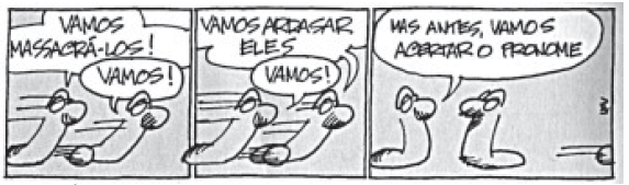 O humor da tira decorre da reação de uma das cobras com relação ao uso de pronome pessoal reto, em vez de pronome oblíquo. De acordo com a norma padrão da língua, esse uso é inadequado, pois