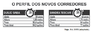 Duílio tem o IMC 27,3 e Sandra tem o IMC 29,1estando ambos na categoria de sobrepeso.