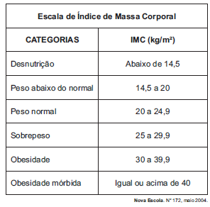 No quadro é apresentada a Escala de Índice de Massa Corporal com as respectivas categorias relacionadas aos pesos.