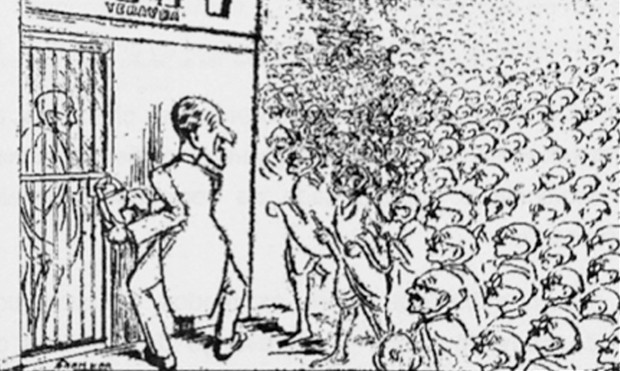 O cartum, publicado em 1932, ironiza as consequências sociais das constantes prisões de Mahatma Gandhi pelas autoridades britânicas, na Índia, demonstrando