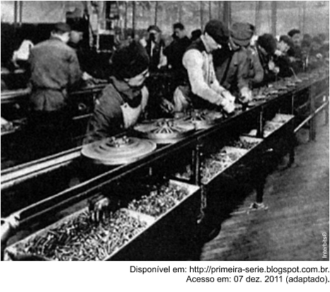 Na imagem do início do século XX, identifica-se um modelo produtivo cuja forma de organização fabril baseava-se na