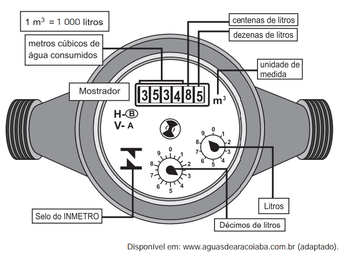 Considerando as informações indicadas na figura, o consumo total de água registrado nesse hidrômetro, em litros, é igual a