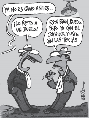 A charge evoca uma situação de disputa. Seu efeito humorístico reside no(a)