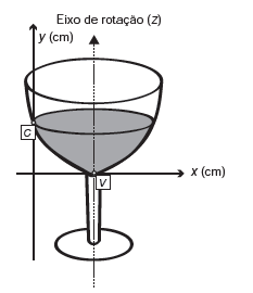 A função real que expressa a parábola, no plano cartesiano da figura, é dada pela lei  onde C é a medida da altura do líquido contido na taça, em centímetros. Sabe-se que o ponto V, na figura, representa o vértice da parábola, localizado sobre o eixo x.