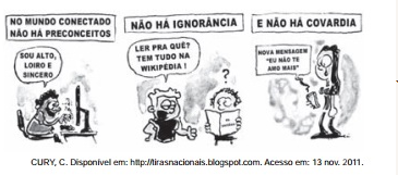 A tirinha denota a postura assumida por seu produtor frente ao uso social da tecnologia para fins de interação e de informação. Tal posicionamento é expresso, de forma argumentativa, por meio de uma atitude