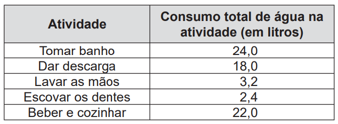 Se cada brasileiro adotar o consumo de água indicado no quadro, mantendo o mesmo consumo nas demais atividades, então economizará diariamente, em média, em litros de água,
