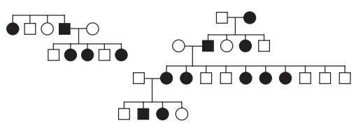 No heredograma, os símbolos preenchidos representam pessoas portadoras de um tipo raro de doença genética. Os homens são representados pelos quadrados e as mulheres, pelos círculos.