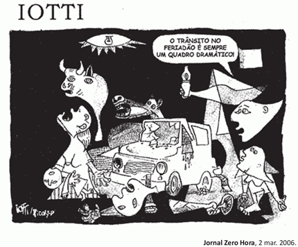 Na criação do texto, o chargista Iotti usa criativamente um intertexto: os traços reconstroem uma cena de Guernica, painel de Pablo Picasso que retrata os horrores e a destruição provocados pelo bombardeio a uma pequena cidade da Espanha. Na charge, publicada no período de carnaval, recebe destaque a figura do carro, elemento introduzido por lotti no intertexto. Além dessa figura, a linguagem verbal contribui para estabelecer um diálogo entre a obra de Picasso e a charge, ao explorar