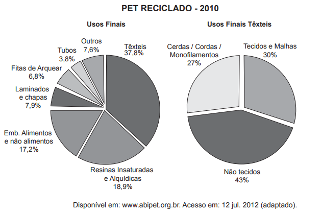 De acordo com os gráficos, a quantidade de embalagens PET recicladas destinadas à produção de tecidos e malhas, em kton, é mais aproximada de
