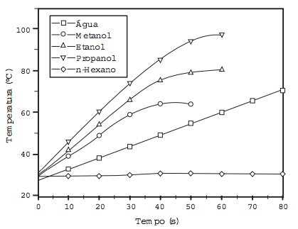O aquecimento de um material por irradiação com micro-ondas ocorre por causa da interação da onda eletromagnética com o dipolo elétrico da molécula. Um importante atributo do aquecimento por micro-ondas é a absorção direta da energia pelo material a ser aquecido. Assim, esse aquecimento é seletivo e dependerá, principalmente, da constante dielétrica e da frequência de relaxação do material. O gráfico mostra a taxa de aquecimento de cinco solventes sob irradiação de micro-ondas.
