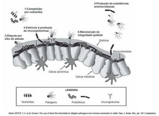 Vários métodos são empregados para prevenção de infecções por microrganismos. Dois desses métodos utilizam microrganismos vivos e são eles: as vacinas atenuadas, constituidas por patógenos avirulentos, e os probióticos que contém bactérias benéficas. Na figura são apresentados cinco diferentes mecanismos de exclusão de patógenos pela ação dos probióticos no intestino de um animal.