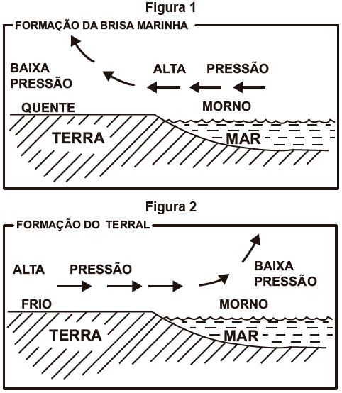 Nas imagens constam informações sobre a formação de brisas em áreas litorâneas. Esse processo é resultado de