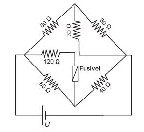 Fusível é um dispositivo de proteção contra sobrecorrente em circuitos. Quando a corrente que passa por esse componente elétrico é maior que sua máxima corrente nominal, o fusível queima. Dessa forma, evita que a corrente elevada danifique os aparelhos do circuito. Suponha que o circuito elétrico mostrado seja alimentado por uma fonte de tensão U e que o fusível suporte uma corrente nominal de 500 mA.