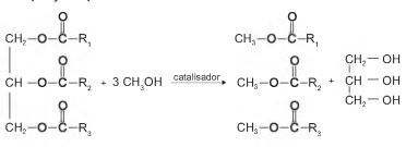 O biodiesel é um biocombustível obtido a partir de fontes renováveis, que surgiu como alternativa ao uso do diesel de petróleo para motores de combustão interna. Ele pode ser obtido pela reação entre triglicerídeos, presentes em óleos vegetais e gorduras animais, entre outros, e álcoois de baixa massa molar, como o metanol ou etanol, na presença de um catalisador, de acordo com a equação química:
