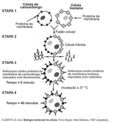 Visando explicar uma das propriedades da membrana plasmática, fusionou-se uma célula de camundongo com uma célula humana, formando uma célula híbrida. Em seguida, com o intuito de marcar as proteínas de membrana, dois anticorpos foram inseridos no experimento, um específico para as proteínas de membrana do camundongo e outro para as proteínas de membrana humana. Os anticorpos foram visualizados ao microscópio por meio de fluorescência de cores diferentes.