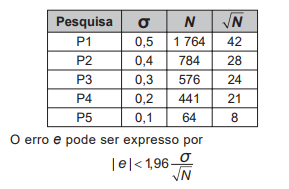 O instituto tem 5 pesquisas recentes, P1 a P5, sobre o tema objeto da encomenda e irá usar a que tiver o erro menor que o pedido.