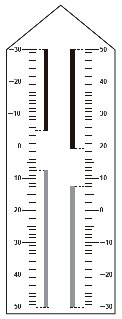 Neste modelo de termômetro, os filetes na cor preta registram as temperaturas mínima e máxima do dia anterior e os filetes na cor cinza registram a temperatura ambiente atual, ou seja, no momento da leitura do termômetro.