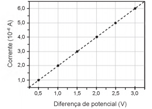 Dispositivos eletrônicos que utilizam materiais de baixo custo, como polímeros semicondutores, têm sido desenvolvidos para monitorar a concentração de amônia (gás tóxico e incolor) em granjas avícolas. A polianilina é um polímero semicondutor que tem o valor de sua resistência elétrica nominal quadruplicado quando exposta a altas concentrações de amônia. Na ausência de amônia, a polianilina se comporta como um resistor ôhmico e a sua resposta elétrica é mostrada no gráfico.