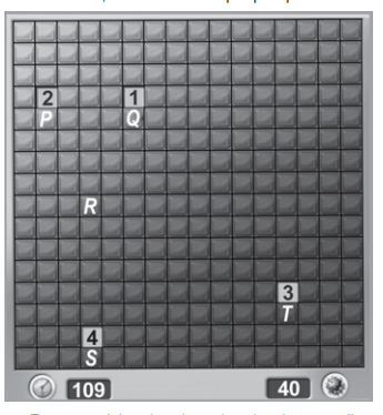 Em sua próxima jogada, o jogador deve escolher dentre os quadrados marcados com as letras P, Q, R, S e T um para abrir, sendo que deve escolher aquele com a menor probabilidade de conter uma mina.