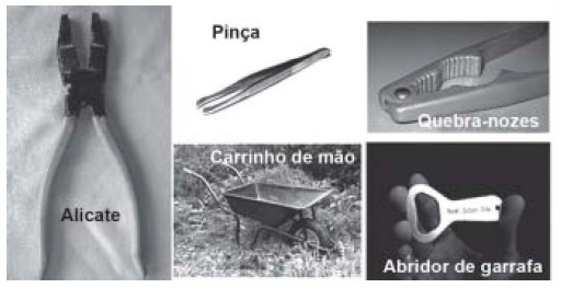As pessoas que utilizam objetos cujo princípio de funcionamento é o mesmo do das alavancas aplicam uma força, chamada de força potente, em um dado ponto da barra, para superar ou equilibrar uma segunda força, chamada de resistente, em outro ponto da barra. Por causa das diferentes distâncias entre os pontos de aplicação das forças, potente e resistente, os seus efeitos também são diferentes. Afigura mostra alguns exemplos desses objetos.