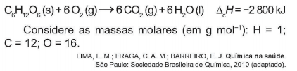 Por meio de reações químicas que envolvem carboidratos, lipídeos e proteínas, nossas células obtêm energia e produzem gás carbônico e água. A oxidação da glicose no organismo humano libera energia, conforme ilustra a equação química, sendo que aproximadamente 40% dela é disponibilizada para atividade muscular.