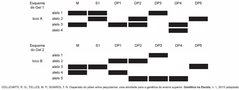 Considere, em um fragmento ambiental, uma árvore matriz com frutos (M) e outras cinco que produziram flores e são apenas doadoras de pólen (DP1, DP2, DP3, DP4 e DP5). Foi excluída a capacidade de autopolinização das árvores. Os genótipos da matriz, da semente (S1) e das prováveis fontes de pólen foram obtidos pela análise de dois locos (loco A e loco B) de marcadores de DNA, conforme a figura.
