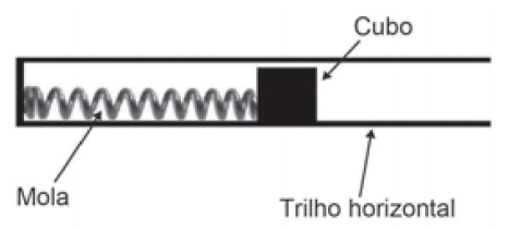 Um projetista deseja construir um brinquedo que lance um pequeno cubo ao longo de um trilho horizontal, e o dispositivo precisa oferecer a opção de mudar a velocidade de lançamento. Para isso, ele utiliza uma mola e um trilho onde o atrito pode ser desprezado, conforme a figura.