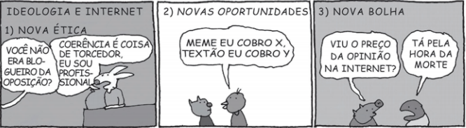 A internet proporcionou o surgimento de novos paradigmas sociais e impulsionou a modificação de outros já estabelecidos nas esferas da comunicação e da informação. A principal consequência criticada na tirinha sobre esse processo é a