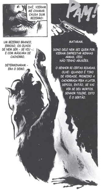 A imagem integra uma adaptação em quadrinhos da obra Grande sertão: veredas, de Guimarães Rosa. Na representação gráfica, a inter-relação de diferentes linguagens caracteriza-se por