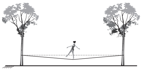 _Slackline_ é um esporte no qual o atleta deve se equilibrar e executar manobras estando sobre uma fita esticada. Para a prática do esporte, as duas extremidades da fita são fixadas de forma que ela fique a alguns centímetros do solo. Quando uma atleta de massa igual a 80 kg está exata mente no meio da fita, essa se desloca verticalmente, formando um ângulo de 10º com a horizontal, como es que matizado na figura. Sabe-se que a aceleração da gravidade é igual a 10 m s–2, cos (10º) = 0,98 e sen(10º) = 0,17.