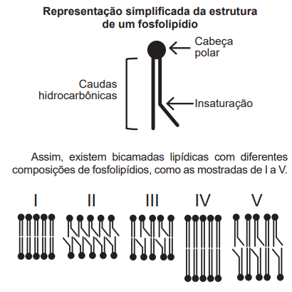 A fluidez da membrana celular é caracterizada pela capacidade de movimento das moléculas componentes dessa estrutura. Os seres vivos mantêm essa propriedade de duas formas: controlando a temperatura e/ou alterando a composição lipídica da membrana. Neste último aspecto, o tamanho e o grau de insaturação das caudas hidrocarbônicas dos fosfolipídios, conforme representados na figura, influenciam significativamente a fluidez. Isso porque quanto maior for a magnitude das interações entre os fosfolipídios, menor será a fluidez da membrana.