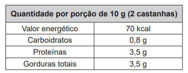 Em uma aula experimental de calorimetria, uma professora queimou 2,5 g de castanha-de-caju crua para aquecer 350 g de água, em um recipiente apropriado para diminuir as perdas de calor. Com base na leitura da tabela nutricional a seguir e da medida da temperatura da água, após a queima total do combustível, ela concluiu que 50% da energia disponível foi aproveitada. O calor específico da água é 1 cal g−1 °C−1, e sua temperatura inicial era de 20 °C.