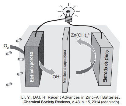 Grupos de pesquisa em todo o mundo vêm buscando soluções inovadoras, visando à produção de dispositivos para a geração de energia elétrica. Dentre eles, pode-se destacar as baterias de zinco-ar, que combinam o oxigênio atmosférico e o metal zinco em um eletrólito aquoso de caráter alcalino. O esquema de funcionamento da bateria zinco-ar está apresentado na figura.