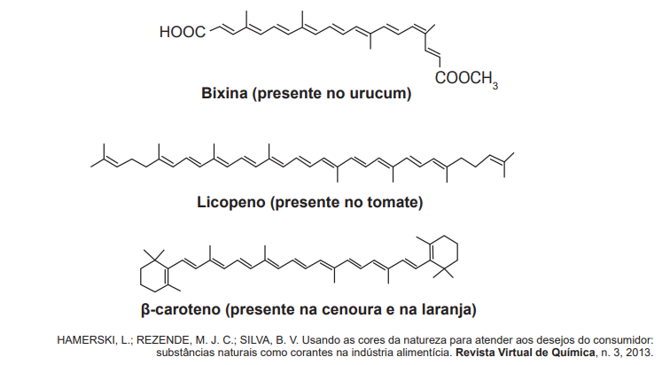 A utilização de corantes na indústria de alimentos é bastante difundida e a escolha por corantes naturais vem sendo mais explorada por diversas razões. A seguir são mostradas três estruturas de corantes naturais.