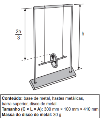 Ao preparar a segunda etapa, ele considera a aceleração da gravidade igual a 10 ms–2 e a velocidade linear do centro de massa do disco desprezível em comparação com a velocidade angular. Em seguida, mede a altura do topo do disco em relação ao chão no ponto mais baixo de sua trajetória, obtendo da altura da haste do brinquedo. As especificações de tamanho do brinquedo, isto é, de comprimento ( C ), largura (L) e altura (A), assim como da massa de seu disco de metal, foram encontradas pelo estudante no recorte de manual ilustrado a seguir.
