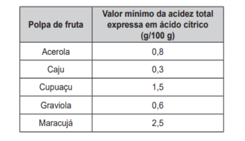 Um dos parâmetros de controle de qualidade de polpas de frutas destinadas ao consumo como bebida é a acidez total expressa em ácido cítrico, que corresponde à massa dessa substância em 100 gramas de polpa de fruta. O ácido cítrico é uma molécula orgânica que apresenta três hidrogênios ionizáveis (ácido triprótico) e massa molar 192 g mol^{-1 }−1. O quadro indica o valor mínimo desse parâmetro de qualidade para polpas comerciais de algumas frutas.