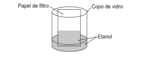 Um experimento simples, que pode ser realizado com materiais encontrados em casa, é realizado da seguinte forma: adiciona-se um volume de etanol em um copo de vidro e, em seguida, uma folha de papel. Com o passar do tempo, observa-se um comportamento peculiar: o etanol se desloca sobre a superfície do papel, superando a gravidade que o atrai no sentido oposto, como mostra a imagem. Para parte dos estudantes, isso ocorre por causa da absorção do líquido pelo papel.