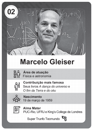 O texto tem o formato de uma carta de jogo e apresenta dados a respeito de Marcelo Gleiser, premiado pesquisador brasileiro da atualidade. Essa apresentação subverte um gênero textual ao