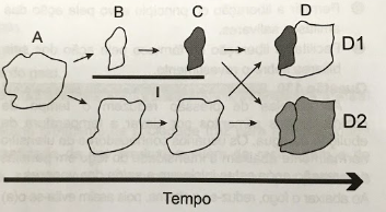 Uma população (momento A) sofre isolamento em duas subpopulações (momento B) por um fator de isolamento (I). Passado um tempo, essas subpopulações apresentam características fenotípicas e genotípicas que as distinguem (momento C), representadas na figura pelas tonalidades de cor. O posterior desaparecimento do fator de isolamento I pode levar, no momento D, às situações Dl e D2.