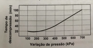 Durante o resgate, para evitar danos a seu organismo, foi necessário que o mergulhador passasse por um processo de descompressão antes de retornar à superfície para que seu corpo ficasse novamente sob pressão atmosférica. O gráfico mostra a relação entre os tempos de descompressão recomendados para indivíduos nessa situação e a variação de pressão.